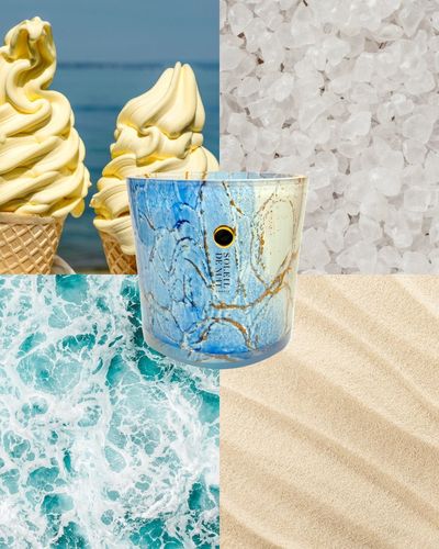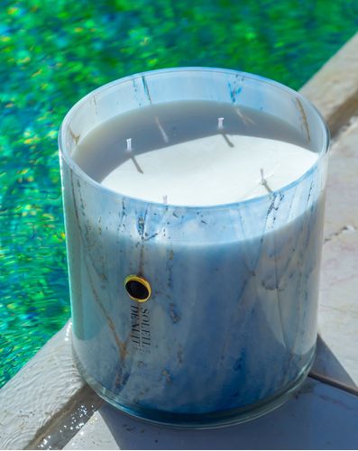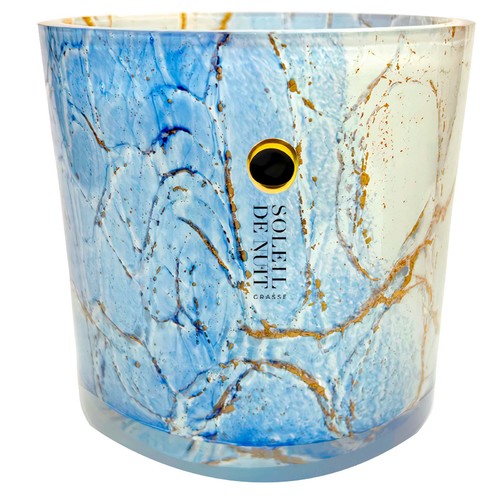 Discover our 3 kg candle - 4 wicks in mouth-blown glass with a sky-blue design inlaid with golden veins and a solar and bewitching scent!